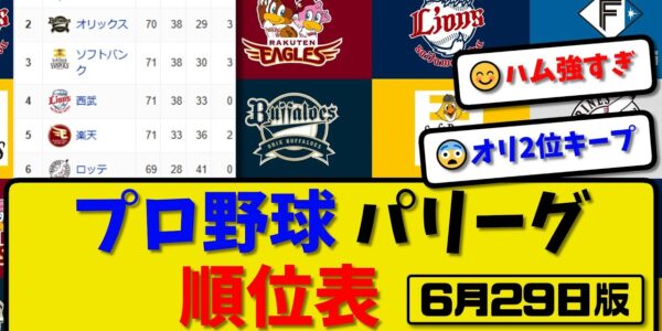 【最新】プロ野球パ・リーグ順位表 6月29日版|オリ2-4楽天|西武1-2ハム|ロッテ1-2ソフ|【まとめ・反応集・なんJ・2ch】