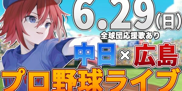 【プロ野球ライブ】広島東洋カープvs中日ドラゴンズのプロ野球観戦ライブ6/29(日)広島ファン、中日ファン歓迎!!!【プロ野球速報】【プロ野球一球速報】中日ドラゴンズ 中日ライブ 中日中継