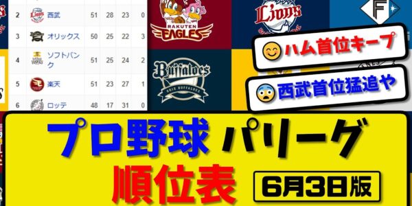 【最新】プロ野球パ・リーグ順位表 6月3日版|ハム0-1阪神|オリ2-5広島|西武1-0ヤク|ソフ4-0中日|楽天3-6横浜|ロッテ-中止-巨人【まとめ・反応集・なんJ・2ch】
