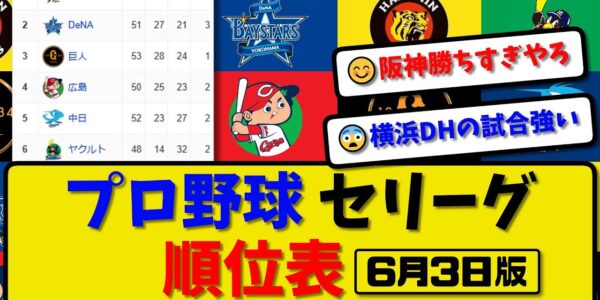 【最新】プロ野球セ・リーグ順位表 6月3日版|阪神1-0ハム|横浜6-3楽天|広島5-2オリ|中日0-4ソフ|ヤク0-1西武|巨人-中止-ロッテ【まとめ・反応集・なんJ・2ch】