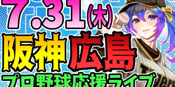 【阪神応援実況】7/31(木)阪神タイガースVS広島東洋カープのプロ野球同時視聴ライブ!阪神ファン、広島ファン歓迎!!!【プロ野球速報/プロ野球ライブ/女性Vtuber】