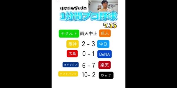 7月15日プロ野球ニュース&MLB大谷翔平 父親になって良いところは?!DeNAが1-0で広島に勝利し連勝!2位巨人と0.5G差!中日が3-2で阪神との延長戦を制し今季2度目の5連勝!