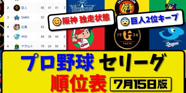 【最新】プロ野球セ・リーグ順位表 7月15日版|阪神2-3中日|広島0-1横浜|ヤク-中止-巨人|【まとめ・反応集・なんJ・2ch】