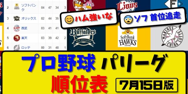 【最新】プロ野球パ・リーグ順位表 7月15日版|オリ6-7楽天|ソフ10-2ロッテ|ハム|西武|【まとめ・反応集・なんJ・2ch】