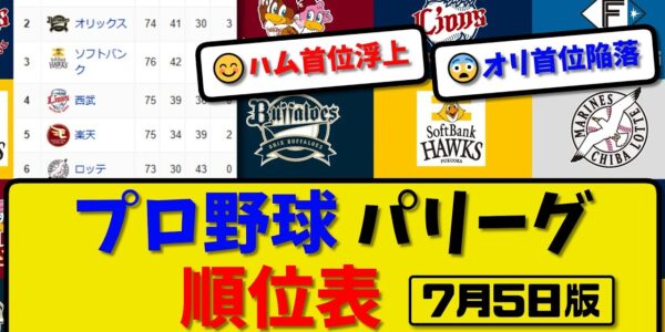 【最新】プロ野球パ・リーグ順位表 7月5日版|ハム12-1楽天|オリ2-8ロッテ|ソフ4-3西武|【まとめ・反応集・なんJ・2ch】