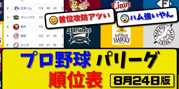 【最新】プロ野球パ・リーグ順位表 8月24日版|ハム1-0ソフ|楽天2-3オリ|ロッテ2-0西武|【まとめ・反応集・なんJ・2ch】
