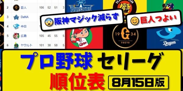 【最新】プロ野球セ・リーグ順位表 8月15日版|巨人6-5阪神|中日3-4横浜|広島1-2ヤク|【まとめ・反応集・なんJ・2ch】