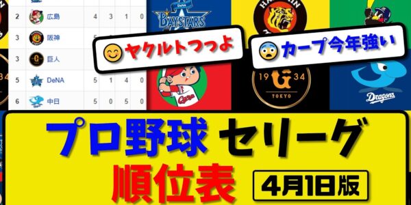 【最新】プロ野球セ・リーグ順位表 4月1日版|中日5-6巨人|阪神1-4横浜|ヤク-中止-広島|【まとめ・なんJ・2ch】