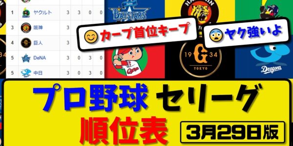 【最新】プロ野球セ・リーグ順位表 3月29日版|広島1-0中日|巨人6-12阪神|横浜3-5ヤク|【まとめ・なんJ・2ch】