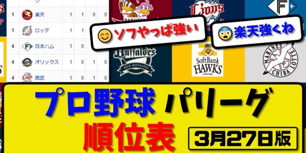 【最新】プロ野球パ・リーグ順位表 3月27日版|ロッテ3-1西武|オリ0-10楽天|ソフ6-5ハム|【まとめ・なんJ・2ch】