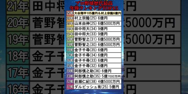 【歴代最高】 プロ野球歴代最高 年俸ランキングTOP15 2025年 大谷翔平(…