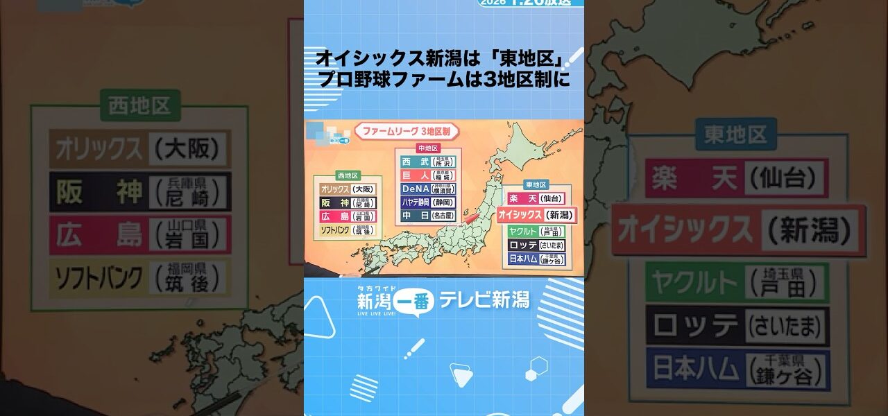 NPBの2軍、ファーム・リーグは、昨シーズンまでのイースタン・ウエスタンの2リーグ制から、東地区・中地区・西地区の3地区制に変更されます。