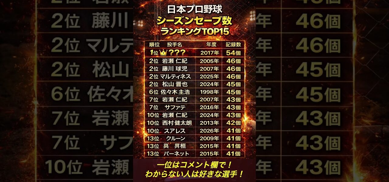 歴代セーブ数TOP15を紹介。