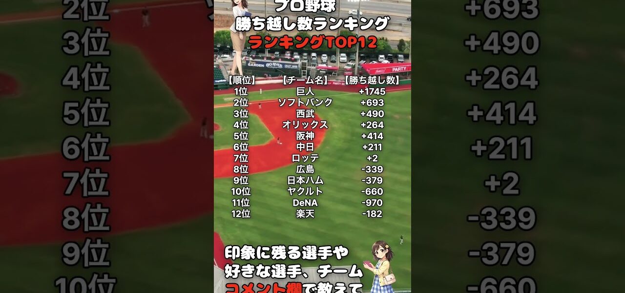 プロ野球 勝ち越し数ランキングTOP12