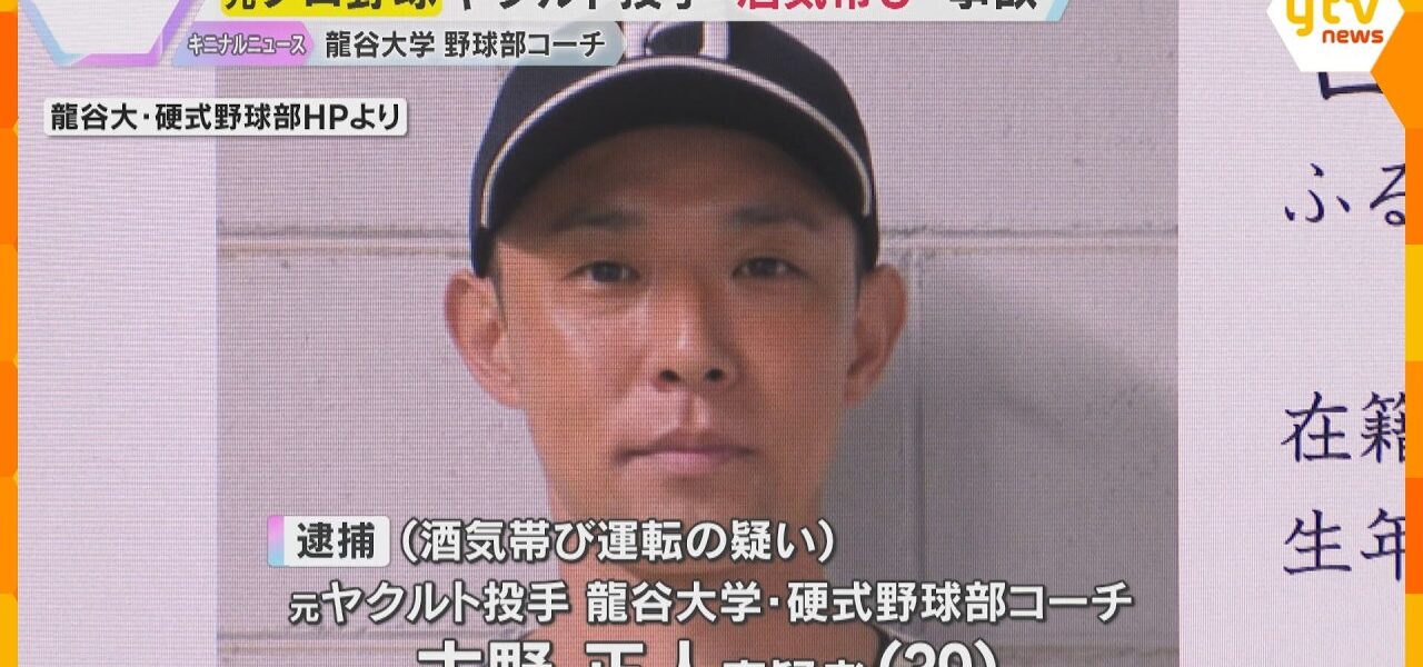 酒気帯び運転の疑いで逮捕されたのは、元プロ野球のヤクルトスワローズの投手で、龍谷大学で硬式野球部のコーチを務める古野正人容疑者(39)です。
