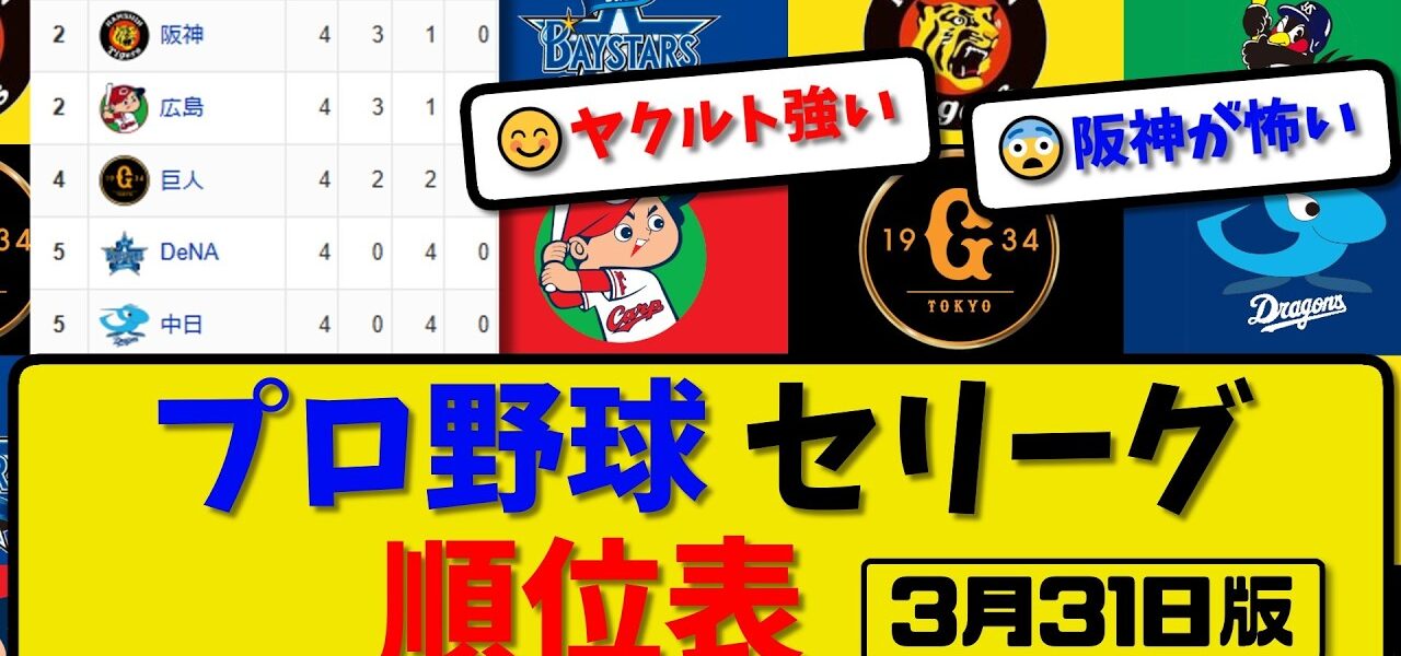 【最新】プロ野球セ・リーグ順位表 3月31日版|ヤク8-3広島|阪神4-1横浜|中日2-5巨人|【まとめ・なんJ・2ch】