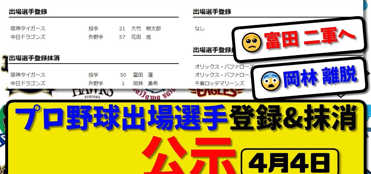 【公示】プロ野球 出場選手登録&抹消 公示4月4日発表|富田&岡林&寺西&髙谷&毛利ら抹消|大竹&花田ら登録【最新・まとめ・なんJ・2ch】