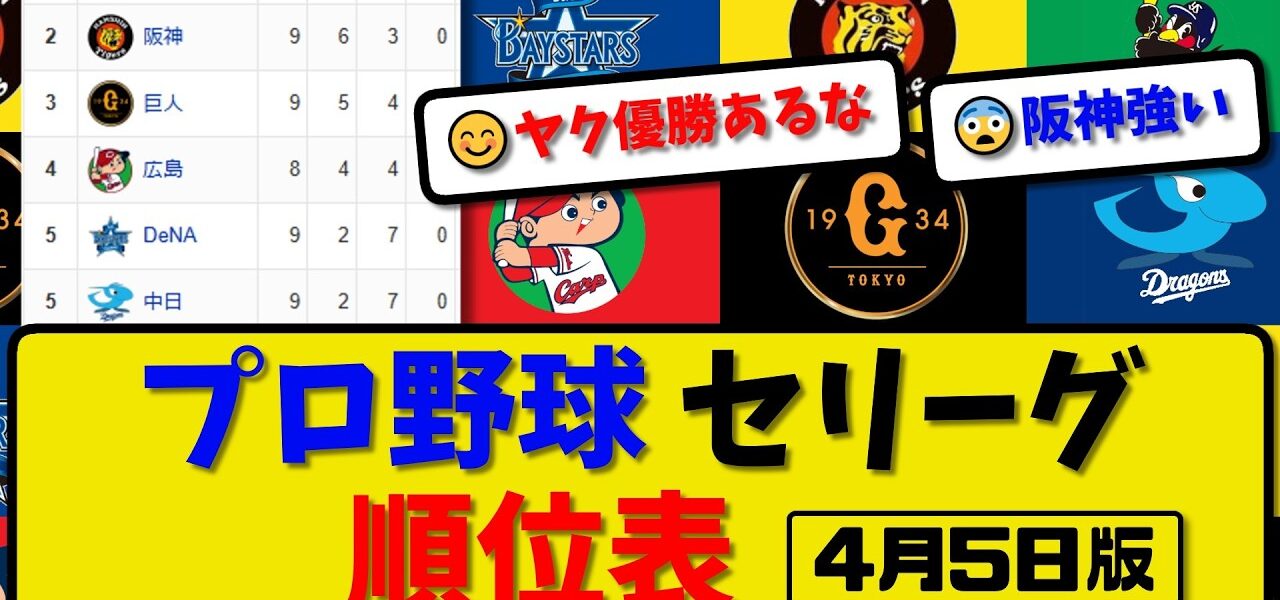 【最新】プロ野球セ・リーグ順位表 4月5日版|ヤク7-5中日|巨人3-2横浜|広島2-1阪神|【まとめ・なんJ・2ch】