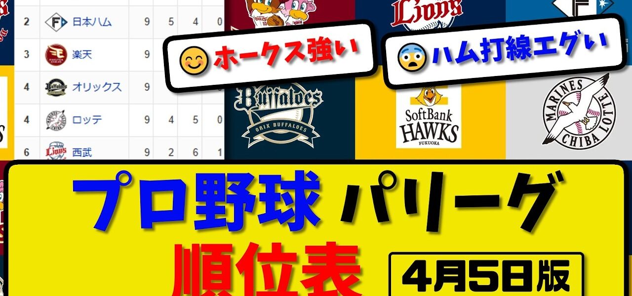 【最新】プロ野球パ・リーグ順位表 4月5日版|ハム8-2オリ|ロッテ3-4ソフ|西武1-1楽天|【まとめ・なんJ・2ch】