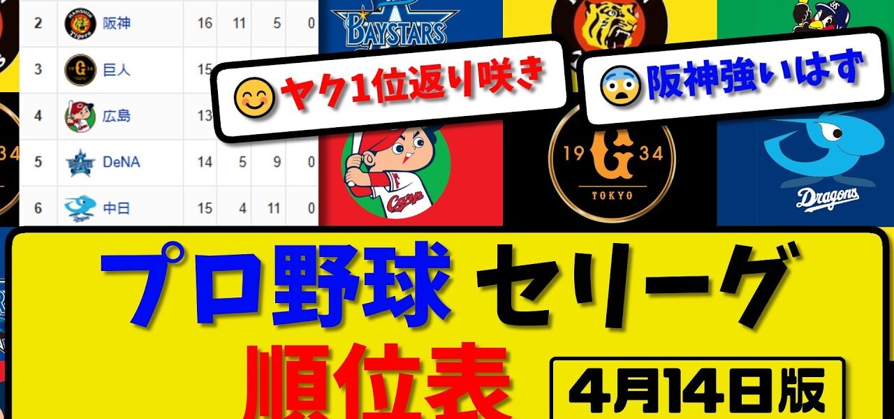 【最新】プロ野球セ・リーグ順位表 4月14日版|ヤク5-3横浜|中日6-2広島|阪神3-4巨人|【まとめ・なんJ・2ch】