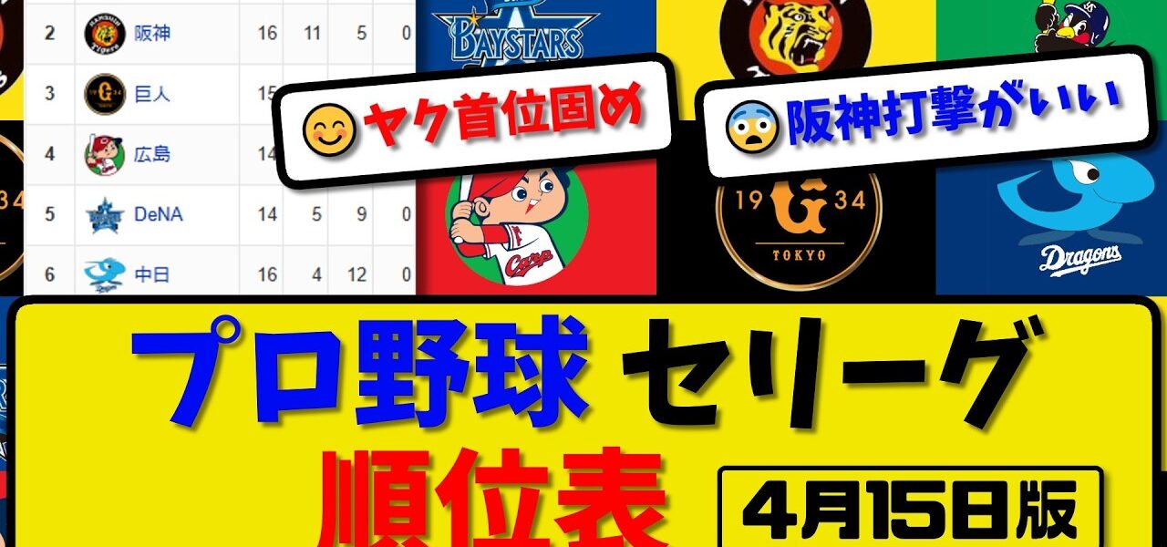 【最新】プロ野球セ・リーグ順位表 4月15日版|中日2-5広島|阪神-中止-巨人|ヤク|横浜|【まとめ・なんJ・2ch】
