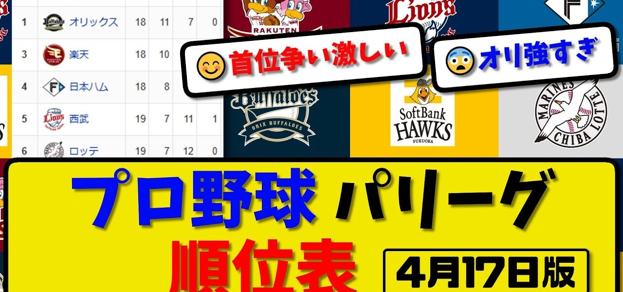【最新】プロ野球パ・リーグ順位表 4月17日版|ハム3-5西武|楽天1-0ロッテ|ソフ4-13オリ|【まとめ・なんJ・2ch】
