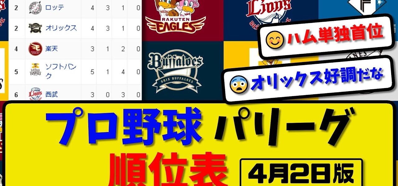 【最新】プロ野球パ・リーグ順位表 4月2日版|ロッテ2-3オリ|ハム3-1ソフ|楽天-中止-西武|【まとめ・反応集・なんJ・2ch】