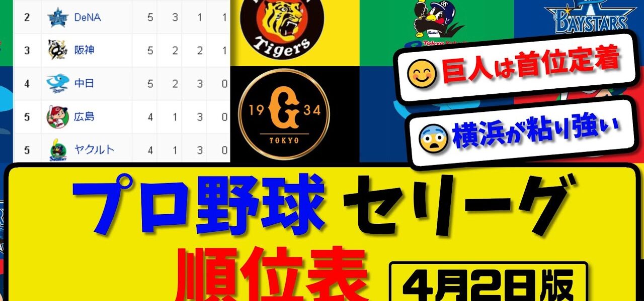 【最新】プロ野球セ・リーグ順位表 4月2日版|ヤク5-4広島|中日0-2巨人|阪神6-6横浜|【まとめ・反応集・なんJ・2ch】