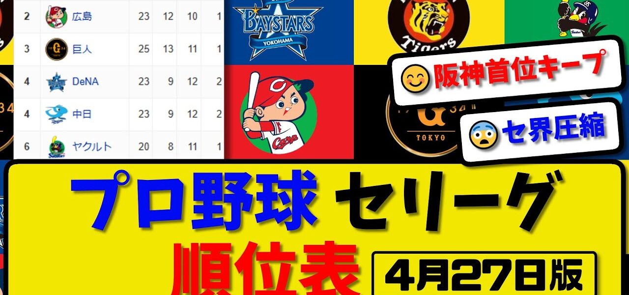 【最新】プロ野球セ・リーグ順位表 4月27日版|中日2-6ヤク|横浜2-1広島|阪神1-2巨人|【まとめ・反応集・なんJ・2ch】
