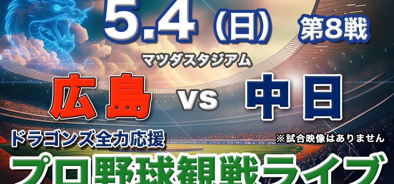 ホームページMV5/4(日)【プロ野球観戦ライブ配信】広島東洋カープvs中日ドラゴンズ 第8戦 マツダスタジアム【ラジオ風生配信】 MV 5/4(日)【プロ野球観戦ライブ配信】広島東洋カープvs中日ドラゴンズ 第8戦 マツダスタジアム【ラジオ風生配信】 管理人 投稿日: 2025年5月4日 明るく楽しく元気よく!をモットーにドラゴンズを応援&実況! 一緒に楽しくプロ野球を観戦しましょう。 他球団ファンも大歓迎! ライブ配信初心者ですので、温かい目でご覧ください。 地上波放送またはネット放送を見ながらの配信となります。 CMでイニング頭が実況できない場合があります。 またタイムラグがありますので、ご了承の上ご視聴ください。 共有: Facebook で共有するにはクリックしてください (新しいウィンドウで開きます) Facebook クリックして X で共有 (新しいウィンドウで開きます) X いいね:いいね 読み込み中… 返信する コメントをキャンセルメールアドレスが公開されることはありません。 ※ が付いている欄は必須項目ですコメント ※ 名前 ※ メール ※ サイト 次回のコメントで使用するためブラウザーに自分の名前、メールアドレス、サイトを保存する。 管理人 すべての投稿を表示 投稿ナビゲーション 前の投稿【プロ野球ライブ】広島東洋カープvs中日ドラゴンズのプロ野球観戦ライブ5/4(日)広島ファン、中日ファン歓迎!!!【プロ野球速報】【プロ野球一球速報】中日ドラゴンズ 中日ライブ 中日中継 次の投稿【架空のプロ野球選手】田岡湿布の伝説エピソード3選#野球#ai#雑学#shorts こちらの記事はいかがですか? MV プロ野球「100人分の1位』走塁部門 管理人 2024年12月24日 MV 8月6日プロ野球ニュース 【中日 vs. 阪神 】: 首位・阪神が執念の逆転星で「M32」八回、佐藤輝が同点打 十回に大山の押し出し死球が決勝点 管理人 2025年8月6日 MV 菊池 捕手のタッチを上手くかわす #プロ野球 #菊池涼介 #広島東洋カープ #巨人 #読売ジャイアンツ #東京ドーム #走塁 #スライディング #抗議 #shorts #おすすめ #面白い 管理人 2025年9月30日 MV 可愛いプロ野球選手の嫁3選 管理人 2025年11月26日