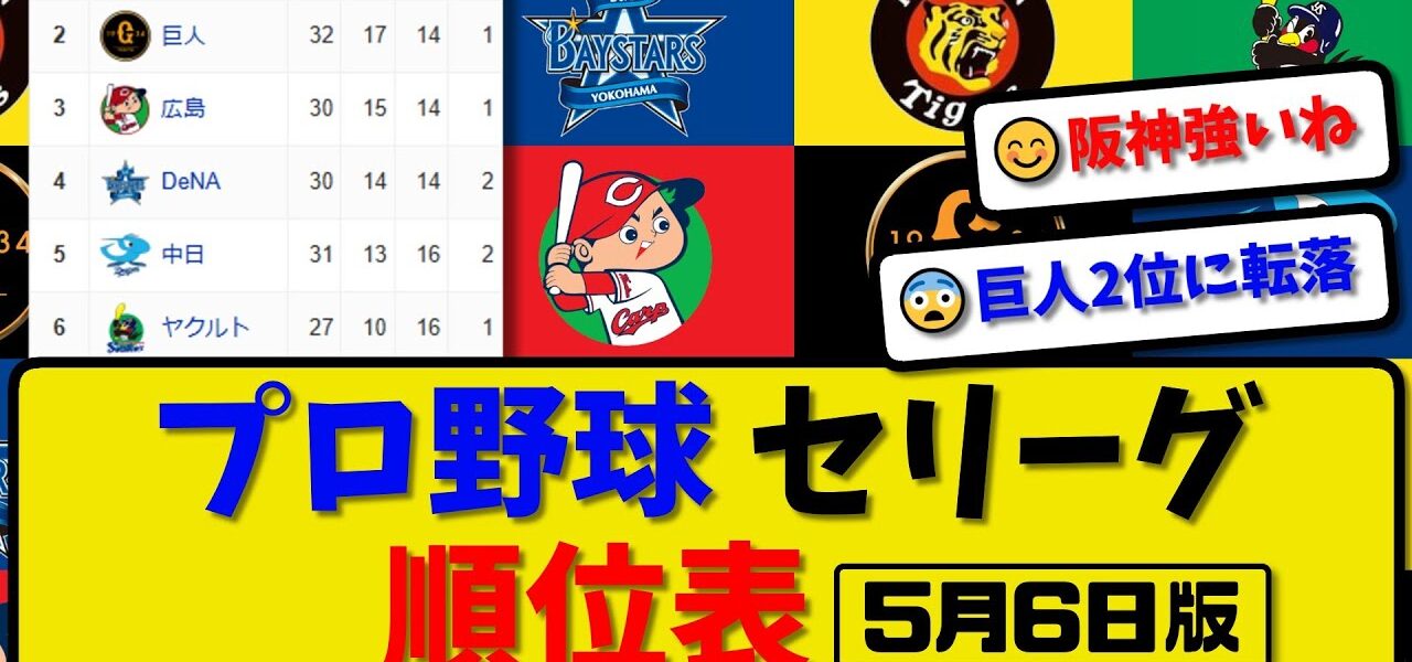 【最新】プロ野球セ・リーグ順位表 5月6日版|中日0-3横浜|巨人1-7阪神|ヤク-中止-広島|【まとめ・反応集・なんJ・2ch】