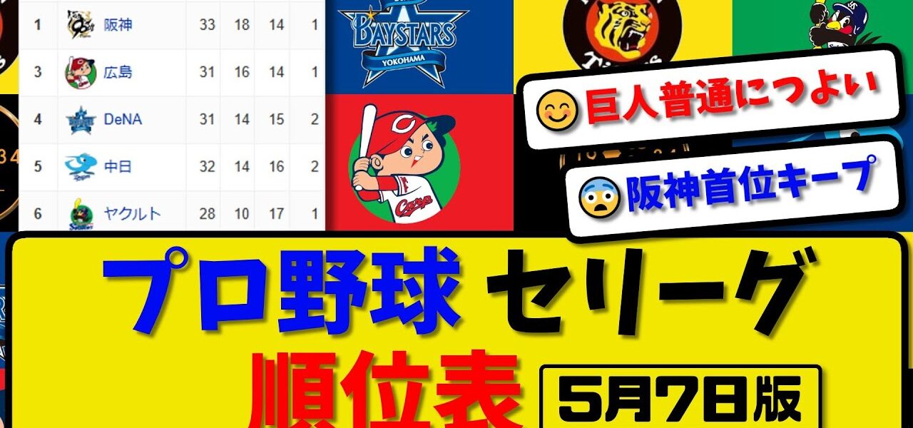 【最新】プロ野球セ・リーグ順位表 5月7日版|巨人6-4阪神|ヤク3-5広島|中日2-1横浜|【まとめ・反応集・なんJ・2ch】