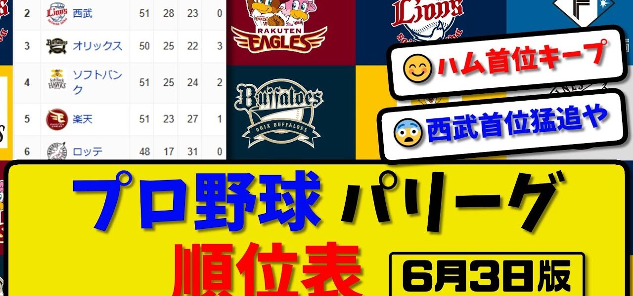 【最新】プロ野球パ・リーグ順位表 6月3日版|ハム0-1阪神|オリ2-5広島|西武1-0ヤク|ソフ4-0中日|楽天3-6横浜|ロッテ-中止-巨人【まとめ・反応集・なんJ・2ch】