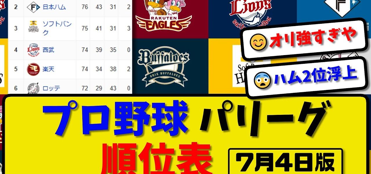 【最新】プロ野球パ・リーグ順位表 7月4日版|ハム7-1楽天|オリ8-6ロッテ|ソフ0-1西武|【まとめ・反応集・なんJ・2ch】