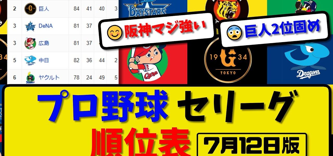 【最新】プロ野球セ・リーグ順位表 7月12日版|中日7-1広島|横浜0-3巨人|阪神5-2ヤク|【まとめ・反応集・なんJ・2ch】