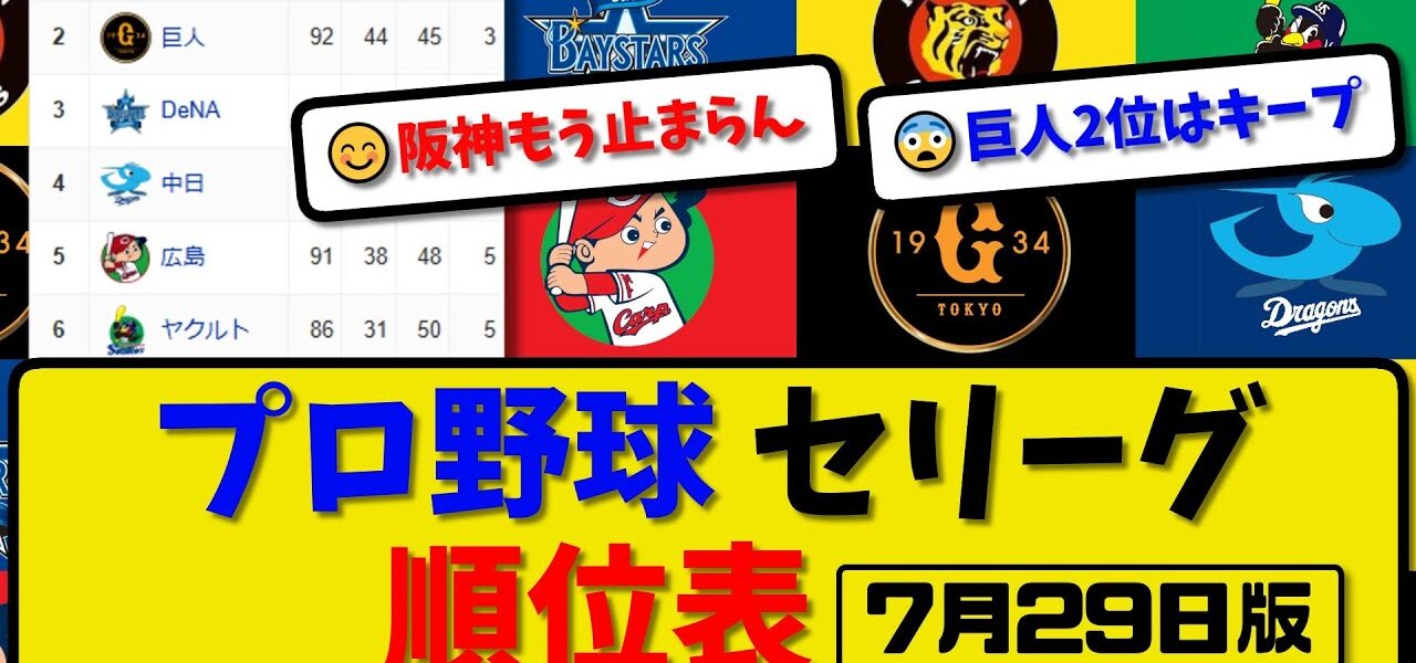 【最新】プロ野球セ・リーグ順位表 7月29日版|横浜1-5ヤク|中日8-5巨人|阪神1-0広島|【まとめ・反応集・なんJ・2ch】