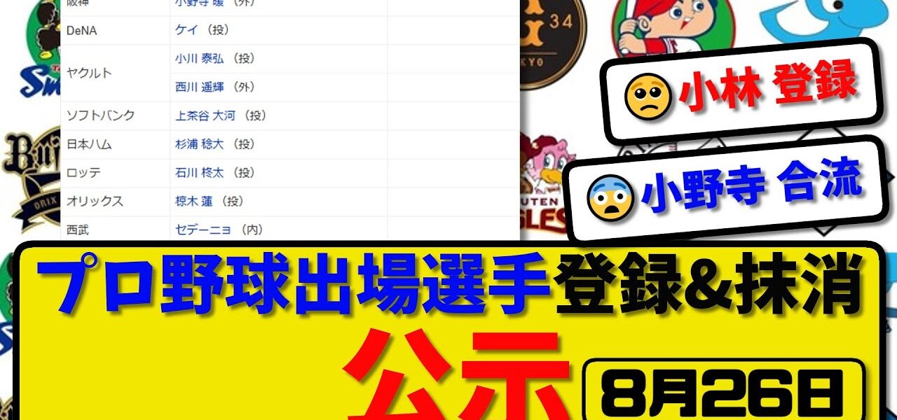 【公示】プロ野球 出場選手登録&抹消 公示8月26日発表|小林&小野寺&西川&上茶谷&杉浦&椋木&セデーニョら登録【最新・まとめ・反応集・なんJ・2ch】