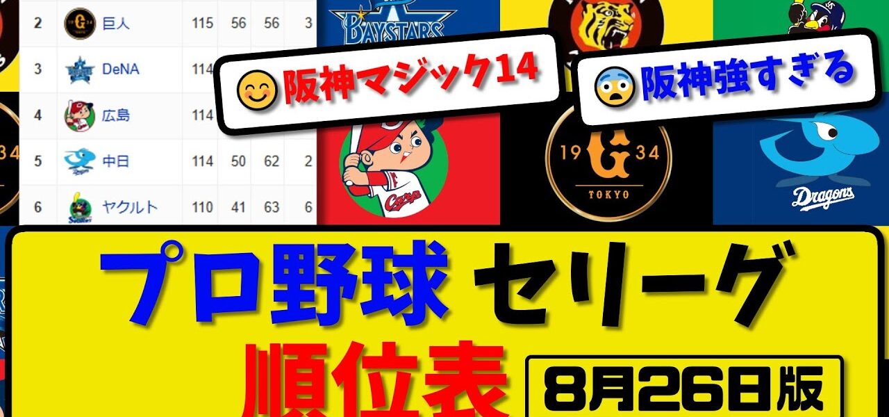 【最新】プロ野球セ・リーグ順位表 8月26日版|横浜2-3阪神|中日0-2ヤク|広島4-1巨人|【まとめ・反応集・なんJ・2ch】