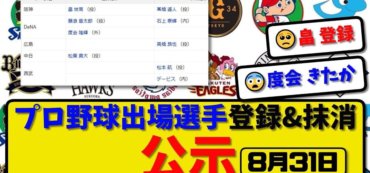 【公示】プロ野球 出場選手登録&抹消 公示8月31日発表|髙橋&石上&高橋&松本&デービスら抹消|畠&度会ら登録【最新・まとめ・反応集・なんJ・2ch】