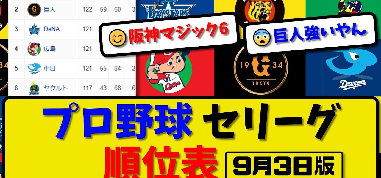 【最新】プロ野球セ・リーグ順位表 9月3日版|巨人5-3ヤク|中日5-2阪神|広島2-1横浜|【まとめ・反応集・なんJ・2ch】