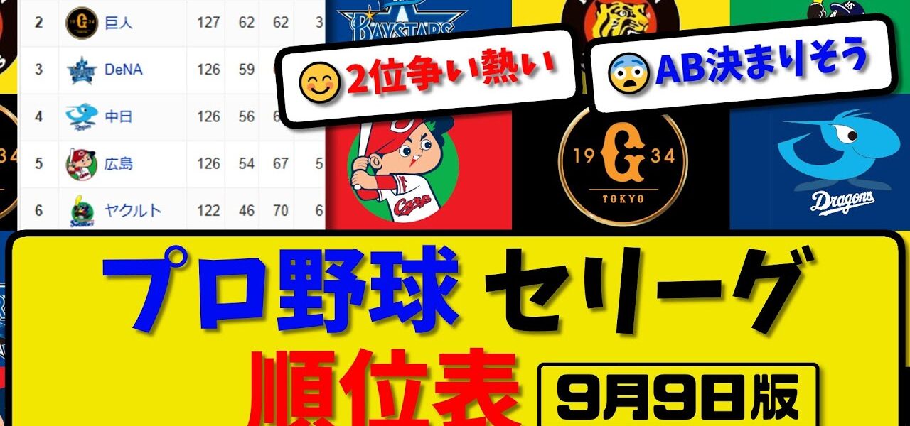【最新】プロ野球セ・リーグ順位表 9月9日版|巨人6-4広島|ヤク3-2中日|阪神0-3横浜|【まとめ・反応集・なんJ・2ch】