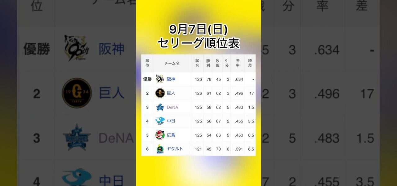 9月7日セリーグ順位表 #プロ野球 #セリーグ