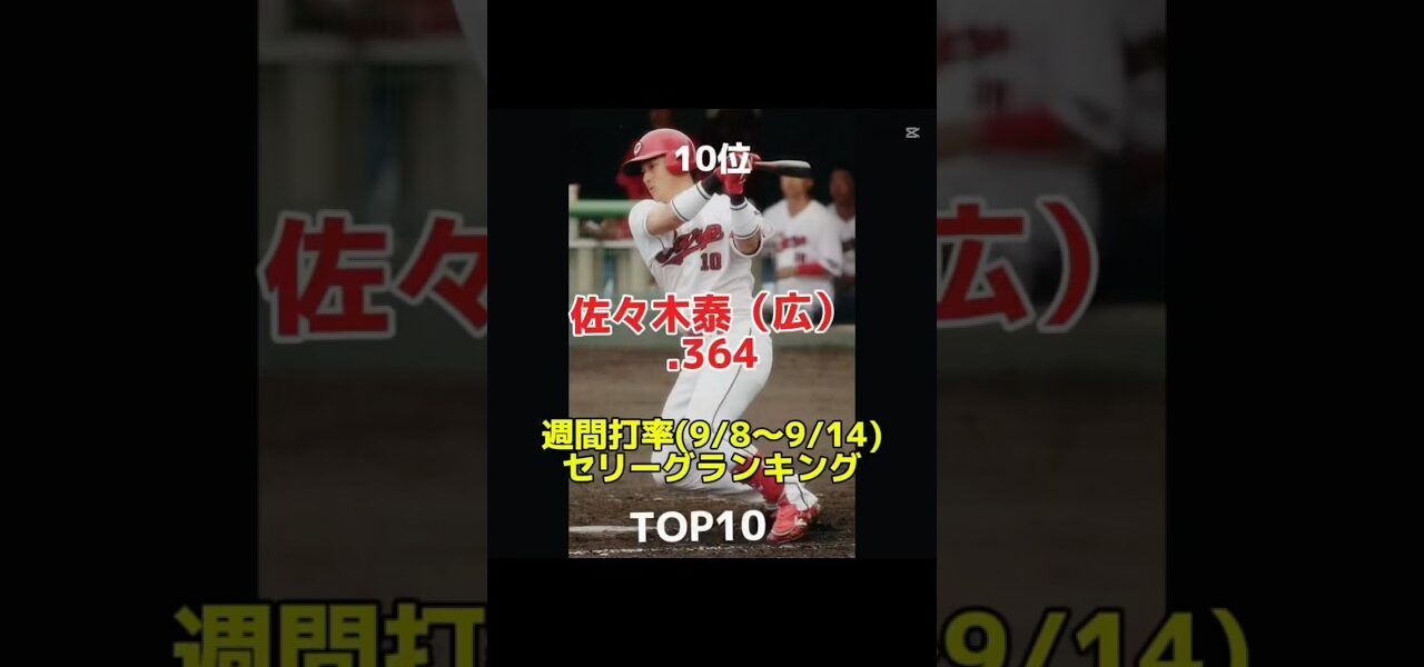 ホームページMVプロ野球 週間打率ランキング(9/8〜9/14)セリーグ版 MV プロ野球 週間打率ランキング(9/8〜9/14)セリーグ版 管理人 投稿日: 2025年9月16日 週間打率ランキングの(9/8〜9/14)セリーグ版です。19打席以上が対象で今回2位〜3位が同率です。 #プロ野球ランキングマ #プロ野球 #ジャイアンツ #プロ野球開幕 #楽天 #野球 #パリーグ#セリーグ #中日ドラゴンズ#巨人#阪神タイガース#横浜DeNAベイスターズ#東京ヤクルトスワローズ#広島カープ#福岡ソフトバンクホークス#東北楽天ゴールデンイーグルス#オリックスバファローズ#埼玉西武ライオンズ#北海道日本ハムファイターズ#千葉ロッテマリーンズ#なんj 共有: Facebook で共有するにはクリックしてください (新しいウィンドウで開きます) Facebook クリックして X で共有 (新しいウィンドウで開きます) X いいね:いいね 読み込み中… 返信する コメントをキャンセルメールアドレスが公開されることはありません。 ※ が付いている欄は必須項目ですコメント ※ 名前 ※ メール ※ サイト 次回のコメントで使用するためブラウザーに自分の名前、メールアドレス、サイトを保存する。 管理人 すべての投稿を表示 投稿ナビゲーション 前の投稿マセラティグラントゥーリズモは有名人に大人気 #maserati #プロ野球 #芸能人 #shorts 次の投稿9月16日プロ野球ニュース&MLB大谷翔平ホームラン王争い!どうなる!? 高校野球“7イニング制” 高野連、識者に聞く「メリットとデメリット」オリックスが7-3でロッテに勝利し連敗4でストップ! こちらの記事はいかがですか? MV バウアー自分でも驚くファインプレー#トレアーバウアー#プロ野球 #野球 #ファインプレー#shorts 管理人 2025年5月2日 MV 坂本勇人 成績と危険度#野球 #プロ野球 #プロスピ #プロスピa #読売ジャイアンツ #坂本勇人 管理人 2024年3月24日 MV 本日リリースされる新作の野球アプリゲームプロ野球ライジングをやってみる【プロ野球RISING】 管理人 2025年3月27日 MV 【プロ野球ライブ】広島東洋カープvs中日ドラゴンズのプロ野球観戦ライブ5/3(土)広島ファン、中日ファン歓迎!!!【プロ野球速報】【プロ野球一球速報】中日ドラゴンズ 中日ライブ 中日中継 管理人 2025年5月3日