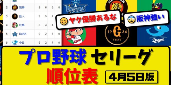 【最新】プロ野球セ・リーグ順位表 4月5日版|ヤク7-5中日|巨人3-2横浜|広島2-1阪神|【まとめ・なんJ・2ch】
