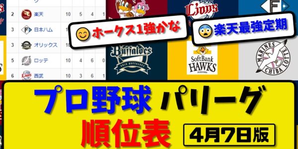 【最新】プロ野球パ・リーグ順位表 4月7日版|ソフ6-8西武|楽天3-0ハム|オリ3-1ロッテ|【まとめ・なんJ・2ch】